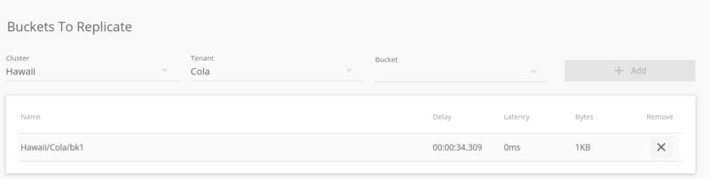 期待値としては、転送元:Hawaii/Cola/bk1, 転送先: Hawaii-r/Coala/bk1 という2つのバケットを作成し、Hawaii側にデータを書き込むと、Hawaii-rのバケットに転送されることを想定してました。インジェストと確認のため両クラスタのバケットに対してNFSサービスを割り当てウォッチしていましたが、転送先へは一向にファイルが現れませんでした。